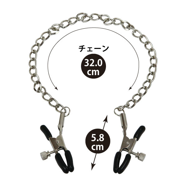 ネジで強弱の調整が可能!2つのクリップを1連チェーンで繋いだ、クールな乳首クリップ。乳首を挟む部分が柔らかなゴムで出来ている為、肌を傷付ける事なく安心してお使い頂けます。挟む強さを変更できるネジ調整式ですので、初めての方でも適度な「痛気持ちいい」快感を楽しむ事が出来ます。SMプレイの幅が広がる、乳首責め用ボディクリップです。 |