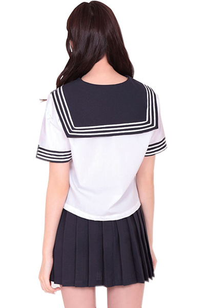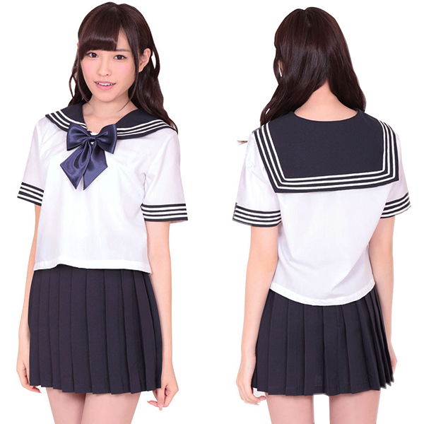 青春時代を思い出させる本格的な制服コスチューム。セーラー服の定番、白のブラウスにプリーツスカートのセット!胸元には紺色リボンをトッピング!袖と襟の白い3本ラインが学生らしいデザイン!可愛いセーラー服コスチュームに身を包んで、思い出に浸っちゃって下さい。