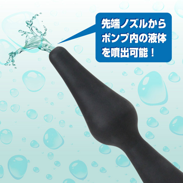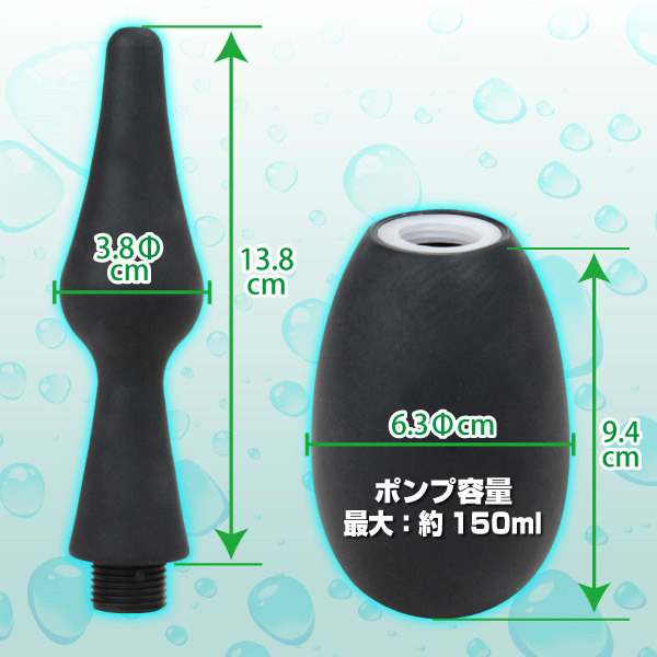 円錐形アナルプラグと洗浄ポンプが合体!浣腸も楽々、いいとこ取りのアナルグッズ。軽くて持ち運びも簡単!黒いマットシリコンで出来た、アナル用の簡易洗浄器です。円錐形プラグの先端から液体を噴射!ノズルと容量150mlのポンプに分割でき、液体の充填も簡単です。アナルプレイを快適に楽しめる、アイデア商品です。※専用の取替ヘッド(b19707)(b19708)(b19709)(b19710)(b20854)も販売中です。