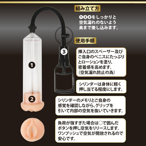 日々の成長を実感!手動式のペニス増大ポンプ「ビギナーベーシックペニスポンプ」。オナホールのような挿入口の装着パーツが肌に密着して、安定感のある吸引を実現。メモリ付きのシリンダーや、空気を瞬時に開放出来るワンプッシュの空気抜きボタンなど、便利機能を搭載した安心設計。初心者の方でも気軽にお使い頂けるチントレグッズです。 |