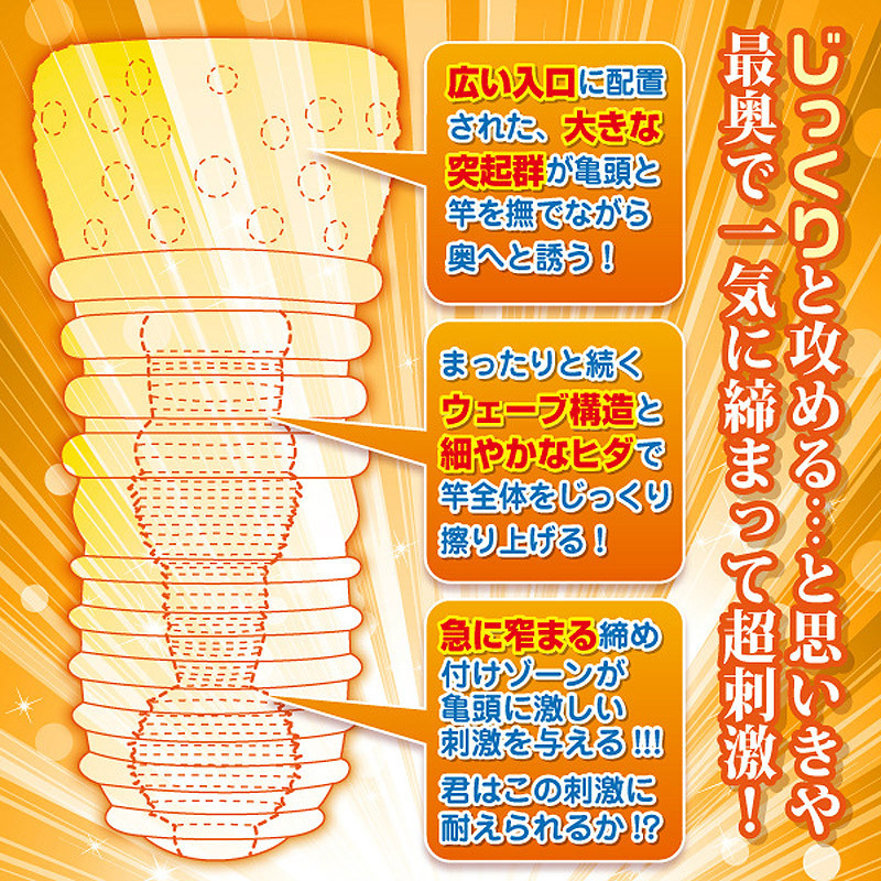 攻めの快感にムスコも即ノックアウト?バツグンの締め付けが魅力の貫通型オナホール。●挿れやすさ満点の大きな挿入口●入り口から丸見えの突起群で奥へと誘導●中盤の微細ヒダでまったり&じっくり刺激●突然の極狭ゾーンで亀頭に高刺激●むっちり肉厚なハードエラストマー使用●ミニローション付属。スローセックスのようにまったり楽しめる…と思いきや突然現れるキツキツゾーン!キュッと締め上げる魅惑のトレーニングに完敗必至のクリアオナホールです。 |