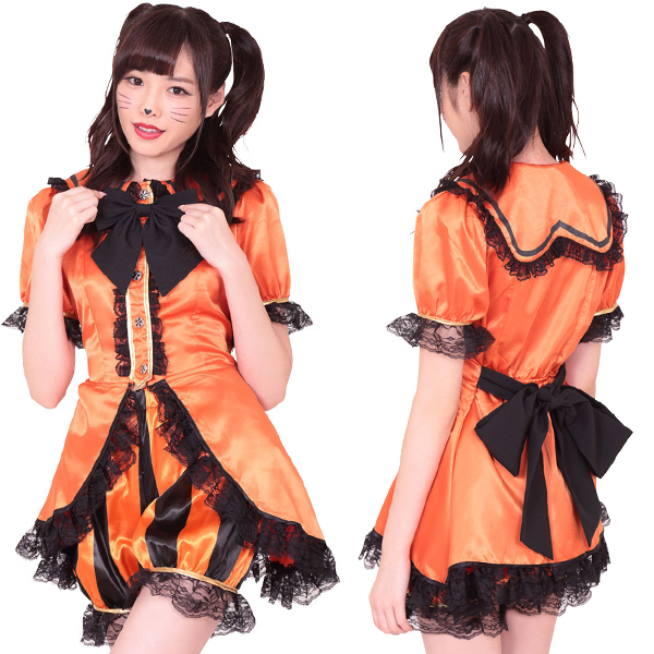 オレンジ×ブラックのパンプキン色がとっても可愛い、かぼちゃのお姫様コスチューム。●トップス・パンツ・リボンの3点セット●着脱しやすいセパレートタイプ●全体を縁取るようにあしらった黒レースが女の子らしさをUP●黒の縦じま入りのふっくら可愛いかぼちゃパンツ●キュートに決まる黒リボン。ハロウィンパーティーに打ってつけのコスプレ衣装です。 |