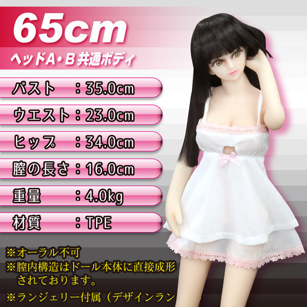 仕様:パッケージ:66.5×27.5×17.5cm 本体:身長65cm・体重:約4.0kg スリーサイズ:B35cm・W23・H34cm 膣長16.0cm セット内容:本体、アイカラー、カツラ、専用衣装、USB式オナホウォーマー、コーム、ネイルグルー、手袋、洗浄用ポンプ