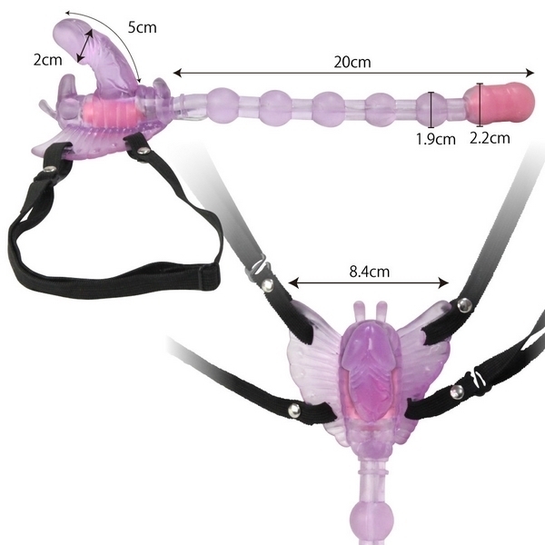 ガッシリ固定で3点同時責め!ベルト固定式のバタフライ型ローター「バタフライエフェクト」。●挿入したままベルトで固定可能●裏側の小突起でクリトリス責め●ペニス型の突起でヴァギナ責め●20cmのロングビーズでアナル責め●柔らかで丈夫なエラストマー素材●ヴァギナとアナル側に強力モーター●7種類の振動パターンを搭載。前も後ろも強力悶絶刺激!奥深くまで響く快感振動のベルト装着型ローター。バタフライのディルド部とアナルビーズ先端にダブルモーターを搭載!ゴム製ベルトでしっかりと固定できるので、装着したまま外出すれば屋外プレイもお楽しみ頂けます。 |