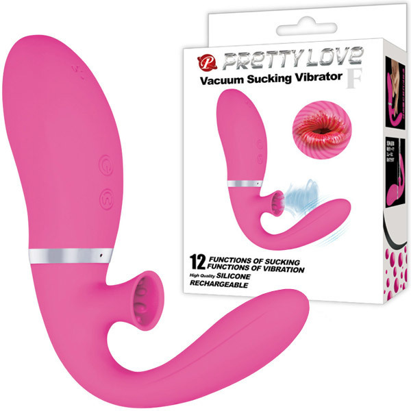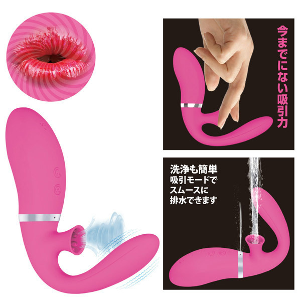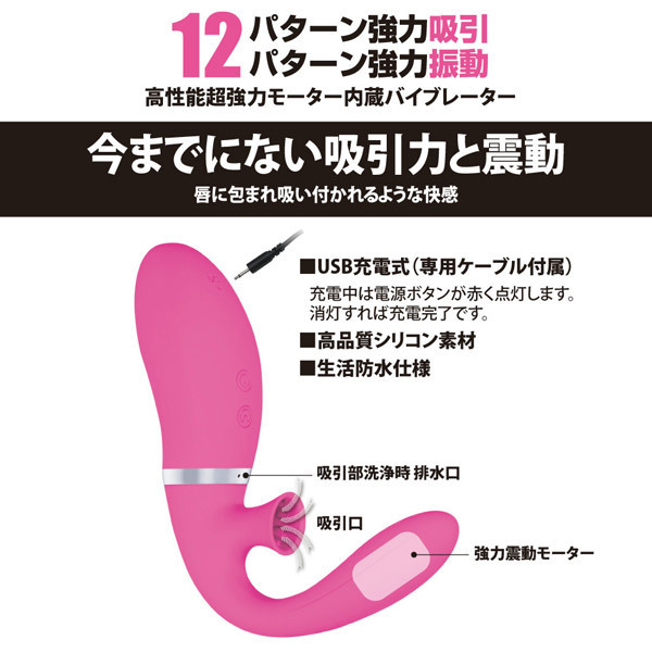 挿入しながら強力バキューム♪クリバイブに吸引機能を搭載した新感覚のバキュームバイブレーター「プリティラブ バキュームサッキングバイブレーターF」。クリ吸引グッズとGスポットバイブが合体!ありそうでなかったF字型バイブレーター。セルフプレイに最適なF型フォルムで驚きのフィット感を体感!肌触り抜群の高品質シリコンボディは全長10cm、最大径は3cm。挿入部ヘッドに内蔵された高性能モーターがGスポットを刺激。さらに、唇に吸い付かれるような刺激を生み出す吸引機能を搭載!強力な12パターンの吸引&振動を味わえます。フル充電約90分で連続稼働約50分のUSB充電式(専用ケーブル付属)。クリ吸引部洗浄用の排水口が配置された生活防水仕様!内部までしっかり洗えるので衛生的です。 |