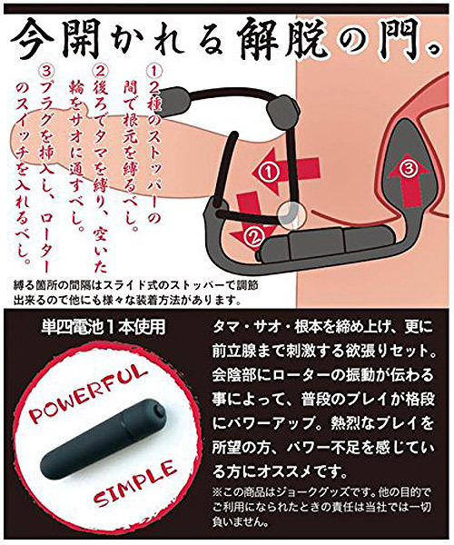 男の快感を助太刀!ループタイデザインのペニスリングと電動アナルプラグを一体化させた「SUKEDACHINAWA(スケダチナワ)僧」。●伸縮性のあるシリコンタイ●玉袋・竿・根元を締め付け●スライド式で簡単に調整可●最大径2.8φcmのプラグ付き●内蔵ローターが会陰部刺激●簡単操作のワンタッチ電源●ローターは着脱可能。今開かれる解脱の門!3点を同時攻めしながら勃起力まで助太刀してくれる男性用補助グッズ。2本のストッパーの間で根元を縛り、後ろ側で玉袋を縛って開いた輪をサオに通したら、アナルプラグを挿入してローターのスイッチをON!締め付けによる持久力UPだけでなく、男性の性感帯である「蟻の門渡り」を刺激することで射精感もUP!快感もパワー不足もアシストしてくれるマルチなアイテムです。 |
