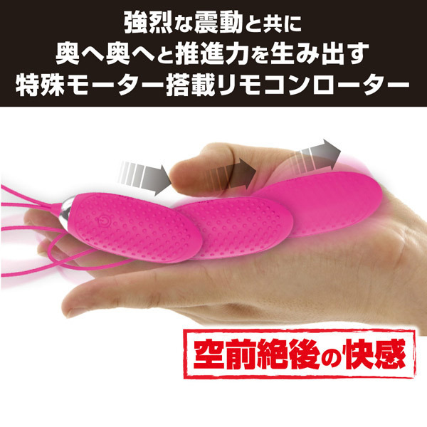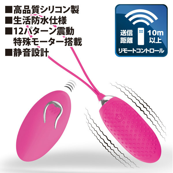 膣の奥へと突き進む強烈振動が特徴のリモコンローター「プリティラブ リモートエッグ2 ストロベリー」。イチゴのような凸凹フォルムのローターは心地良い挿入感の高品質シリコン製。スイッチオンで12種類の多彩な振動パターンと共に、膣の中を突き進む生き物のような動きでGスポやポルチオまで刺激します。最大10mの距離から遠隔操作できるワイヤレス仕様で屋外プレイも楽しめる生活防水&静音設計のストロベリー。本体はUSB充電式(専用コード付属)、フル充電約65分で約46分連続稼働!リモコンは単四電池×1本(別売り)を使用します。 |
