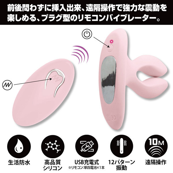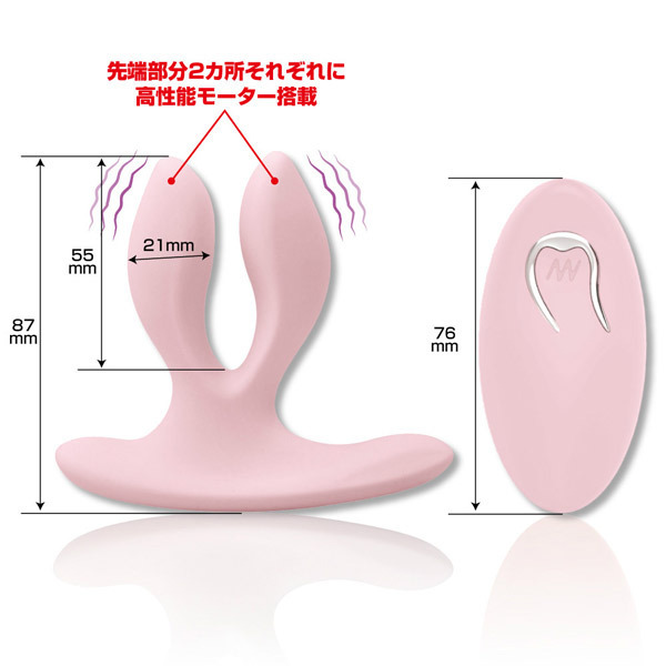 前後問わずに挿入可能!ユニークな二股プラグデザインのリモコンローター「プリティラブ ツーウェイリモートプラグ」。アーム両先端に強力モーターを搭載した二股デザインの高品質シリコン製ローター。12パターンの振動機能を備えた両ヘッドは自在に曲がるフレキシブル仕様!片側のアームのみ挿入すればGスポ+クリトリスの同時刺激も可能に!さらには「押し当て」や「挟み込み」によるピンポイント刺激まで楽しみ方のバリエーションも豊富です。最大10mの距離から遠隔操作できるワイヤレス仕様で屋外プレイも楽しめる『プリティラブ』シリーズのリモコンローター。生活防水仕様のローター本体はUSB充電式、リモコンは単四電池×1本(別売り)を使用します。 |