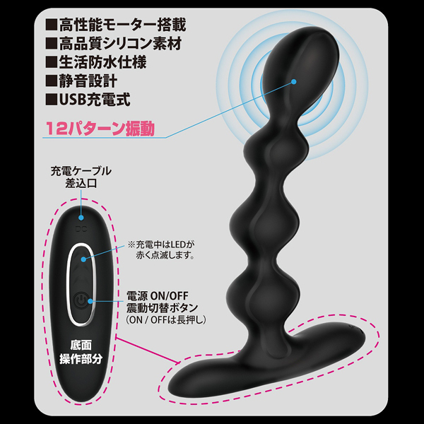 「スティックバキューマー2」等の吸引グッズでお馴染みのプリティラブから新商品が登場!身体の芯に響くような刺激が堪能できる全長17.5cmのロングボディのシリコン製アナルバイブレーター(USB充電式)。先端に内蔵された高性能モーターが、お尻の中で12種類のハイパワー振動!最大内径27mmのビーズでポコポコと刺激しながら根元まで入れれば底面が会陰を刺激、前立腺を貫く刺激と相まった強い快感に息も絶えだえに♪この強烈な振動は貴方の想像を絶する!!充電コード付属 |