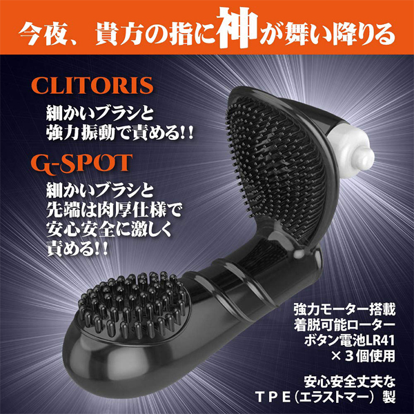 今夜、貴方の指に神が舞い降りる…超絶テクニシャンに変える電動指サック!幅広のブラシが広範囲を捉え、細かいブラシと強力震動で確実にクリを攻める!指先のブラシ部分は肉厚仕様でGスポットを直撃!安心安全に責める事のできる柔らかなエラストマー素材。