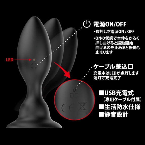 誰にも知られずこっそり楽しむ高性能モーター搭載のUSB充電式アナルプラグ。お尻に挿入して身体を少し傾けるだけで中で本体が曲がり振動がON、強力振動が身体の奥まで響きわたる♪座ったままでも立った状態でも、誰にも知られず密やかに快感振動が楽しめる医療用シリコン採用のアナルプラグ。生活防水&静音設計、専用ケーブル付属 |