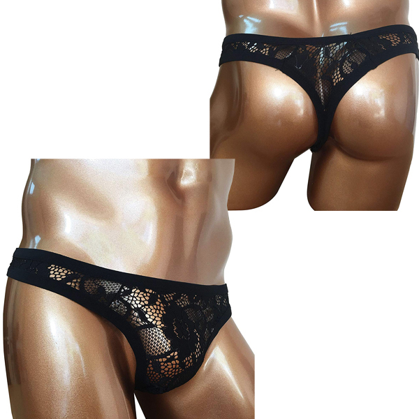 黒の花柄レースが男を華やかに魅せるメンズ用Tバック(ブラック)。網目から程よく透けて見える露出度高めのセクシーな男性用ビキニパンツ!エレガントなデザインは女装用下着に最適です♪生地には伸縮性高く涼しげな素材を使用!洗濯はネットに入れて行うか、手洗いで優しく洗って下さい。 |