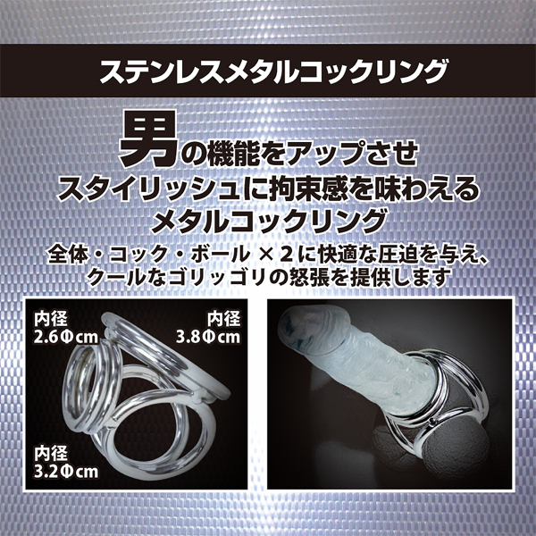 男の機能をスタイリッシュにサポートする金属製のコックリング。男性器の根元3箇所を程よく圧迫!男性補助をするだけでなく拘束感も味わえるメタル製のコックリング。 |