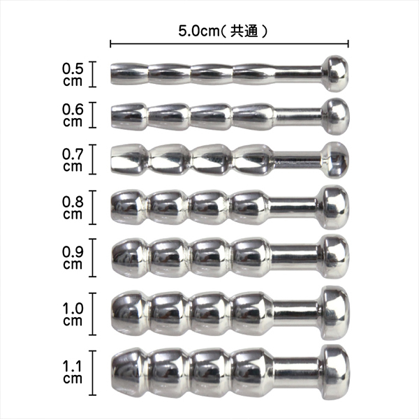 細めから太めまで幅広く試せるお得な7本入り!硬質なメタル素材のビーズタイプブジーのセット。煮沸消毒の出来る金属製で衛生的!自分に合ったサイズでお楽しみ下さい♪内部は中空構造となっています。 |