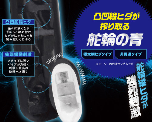 9Vアルカリ電池推奨!超強烈な激震がサオ全体を刺激する電動オナホ(非貫通)。奥に進むほど狭まる内部が締め付けながら極太な横ヒダがニュルリと絡んで激しくねぶる!ラストは先端に装着したローターで最高のひと時へ誘います。※ローターの色はアソートです。