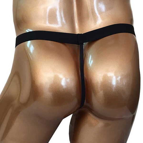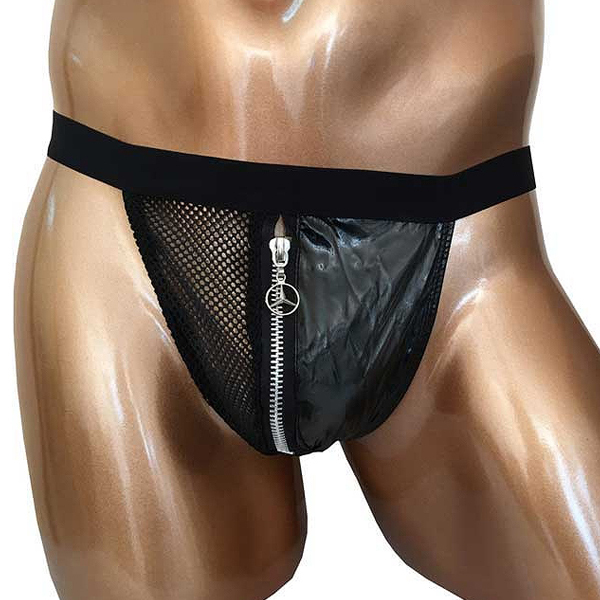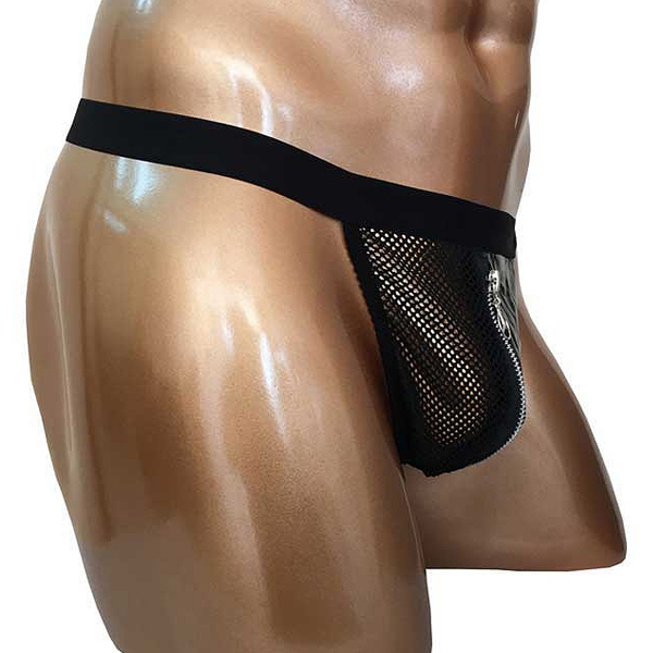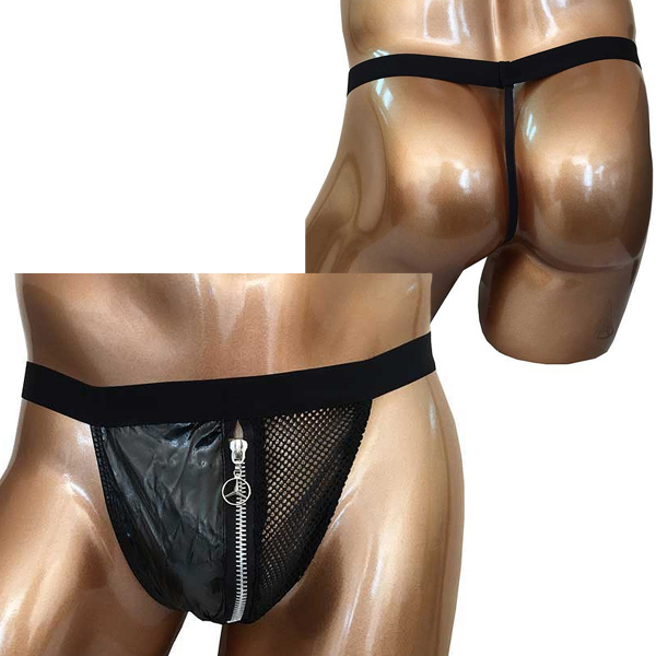 2つの異なる素材を組み合わせたスタイリッシュな男性用GストTバック。太目の黒ゴムでウエストをしっかりホールド!バックは紐状のストリング仕様で、フロントは黒地とメッシュ素材をジッパーでつなぎ合わせたお洒落なデザイン。ブラックカラー、フリーサイズ |