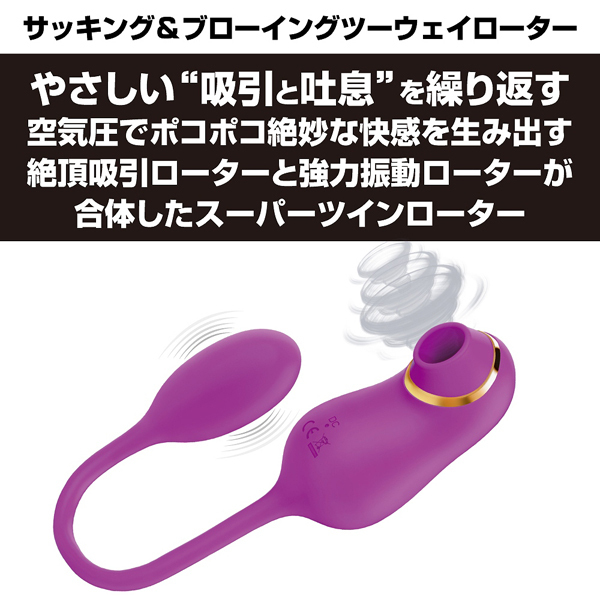 吸引×振動で中外を同時に刺激できるUSB充電式のスーパーツインローター。生活防水加工を施した柔らかく滑らかな高品質シリコンボディ仕様♪4種類の空気圧でポコポコと吸引刺激しつつ、12種類のパターンで強力振動!個別使用はもちろんダブルで使えば快感も倍増♪一つで2度おいしい高性能ローターです◎本体全長41.5cm |