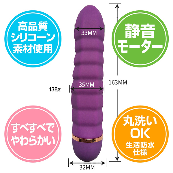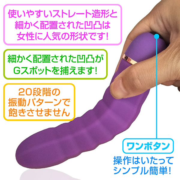 女性に人気の高いストレート造形×蛇腹ボディを組み合わせた電池式バイブ。段々と配置された凹凸がGスポを捉えて振動刺激!素材は肌に優しく柔かい高品質シリコン製。20種類の多彩なアクションがワンボタンで選べるシンプルで使い易い初心者向けバイブ◎単三電池を1本使用 |