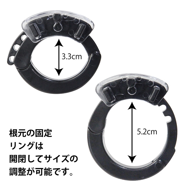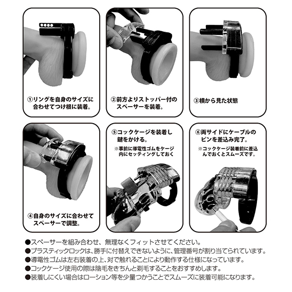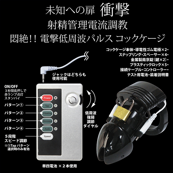 仕様:パッケージ:10.5×12.0×7.0cm 本体:ケージ内径3.2〜3.5cm・亀頭部の内径4.0cm・固定リング内径3.3〜5.2cm セット内容:コントローラー、コックケージ本体、導電性ゴム電極×2、スナップリング、スペーサー×4、金属製南京錠(鍵×2)、プラスティックロック×5、ケーブル 電池:単四電池×2本使用