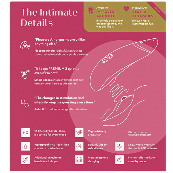 圧倒的な人気を誇るウーマナイザープレミアムが2へバージョンアップした「ウーマナイザー プレミアム2 (ラズベリー)」!強弱12段階から14段階へパワーアップし、従来の吸引バイブに新たに「タッチセンサー機能」と「パイロットコントロール機能」を搭載。タッチセンサー機能では煩わしいボタン操作は必要なく、シリーズの中でも圧倒的に使いやすくなりました♪お肌に近づけると自動で吸引し、離すと自動でストップ!これならボタン操作に不慣れな人でも安心♪さらに予測できない楽しみを味わいたいという方のために弱・中・強3段階のパイロットモードを搭載。ボタン操作をしなくてもウーマナイザーが自動で吸引の強弱をコントロールしてくれるので体感をじっくり味わいたいときに最適です!素材はシリコン/ABS樹脂で2時間のフル充電で連続4時間の使用が可能です。※製造時期によりパッケージが異なる場合がございます。※こちらの商品は受注発注商品の為、ご注文から発送までに3、4営業日掛かる場合が御座います。 |