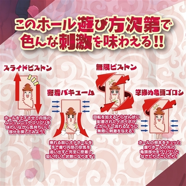 ホール初心者から上級者まで使いやすい定番サイズの非貫通オナホ「僕と淫魔の秘密の契約ノルマは1000発」です。螺旋状に配置されたイボと横ヒダが竿の感度をドンドンアップさせ、淫魔のザー汁絞りが如く亀頭から根本まで「あへあへ」にさせてくれます!特徴的な三段俵責めからスピンイボのスクロール、タコ壺子宮と至れり尽くせり♪3つのゾーンで全く異なる刺激が楽しめる複雑なギミックがあなたを絶頂へと迎えてくれます! |