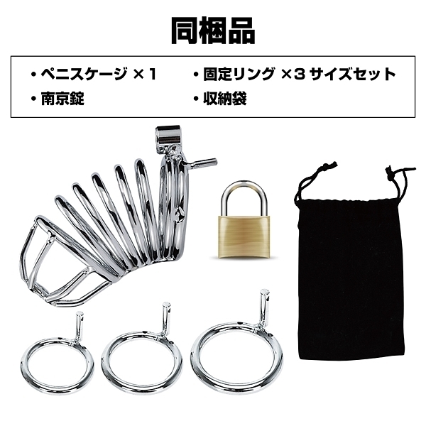 仕様:パッケージ:28.0×18.5cm 本体:ペニスゲージ11.2×3.5cm・固定リング小(内径4.0cm)・固定リング中(内径4.5cm)・固定リング大(内径5.0cm) セット内容:ペニスゲージ、固定リング3サイズセット、南京錠、収納袋