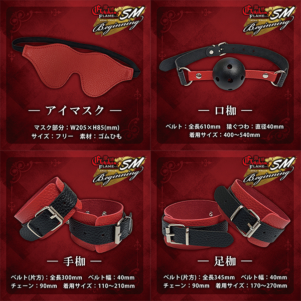仕様:パッケージ:17.0×26.0×7.0cm 本体:@アイマスク(マスク部分8.5×20.5cm、フリーサイズ、素材:ゴムひも)、A口枷(ベルト全長61.0cm・ボール直径4.0cm・着用サイズ40.0〜54.0cm)B手枷(ベルト全長30.0cm・幅4.0cm・チェーン9.0cm・着用サイズ11.0〜21.0cm)C足枷(ベルト(全長34.5cm・ベルト幅4.0cm・チェーン9.0cm・着用サイズ17.0〜27.0cm)Dリード付き首輪(ベルト全長50.0cm・ベルト幅4.0cm・着用サイズ32.0〜40.0cm・リード100cm)E拘束ロープ(長さ4m65cm・太さ0.75cm・素材:組紐)Fバラ鞭(全長53.0cm・鞭32.0cm・持ち手12.0cm)
