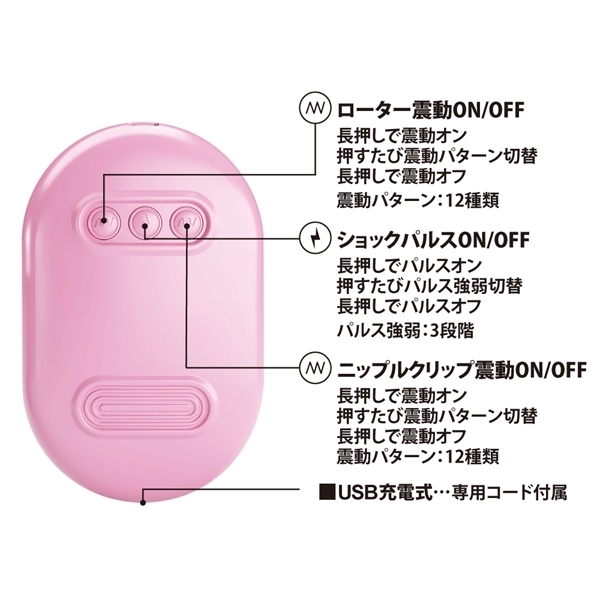 パルスと振動の2つの刺激を楽しめるユニークなアイテムです♪敏感な部分をクリップで挟み、3種類のパルスで心地よい刺激を与えます!同時に円錐型のローターが性感帯をピンポイントで刺激♪パルスと12パターンの強力な振動を別々に操作でき、リラックスした時間を演出します!収納ケース一体型で使いやすく、持ち運びにも便利♪USB充電式でエコに配慮しつつ長時間楽しめます! |