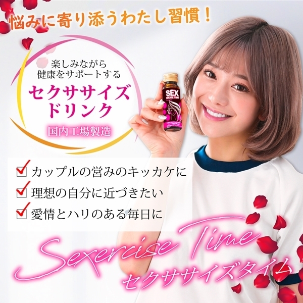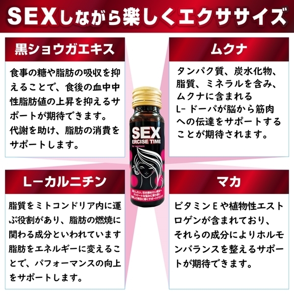 心身ともに自分を高めたい貴女のためのサポートドリンクです♪業界初の「セクササイズ」を実現しました!黒ショウガエキス末、マカエキス末、ムクナエキス末、L−カルニチンフマル酸塩の4つの厳選成分を配合しています♪毎日にメリハリをつけたい方にぴったりのドリンクです!悩みに向き合いたい方、理想の自分に近づきたい方にもおすすめ♪SEXERCISE TIMEは、身も心もスッキリとした充実した日々を目指し、愛情とハリのある毎日へと導きます。【お召上がり方】1日1本を目安に、よく振ってお召し上がりください♪【ご注意】原材料が沈殿を生じたり、時間の経過によって液色が変化する場合がありますが、品質には問題ありません。 |