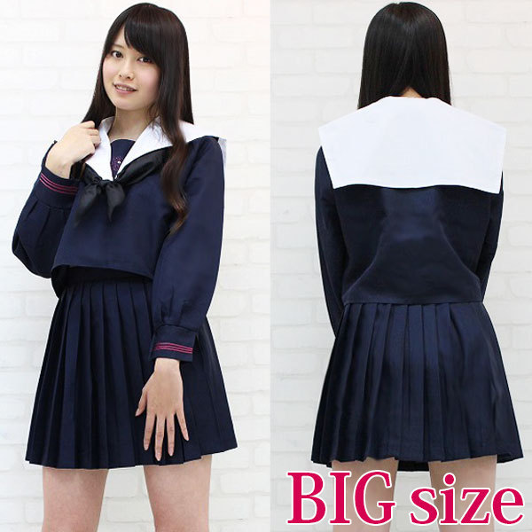 仕様:BIGサイズ:B114cm程度・W71〜89cm 丈:上着51cm(袖丈56cm、肩幅45cm)・スカート45cm・スカーフ120×93×93cm セット内容:上着(横ファスナー、襟・袖に3本ライン入り(赤色)、胸当てに校章入り(赤色)、胸ポケット縫い付け、襟当て(白色)取り外し可)・スカート(横ファスナー、アジャスター有り)・スカーフ・襟当て