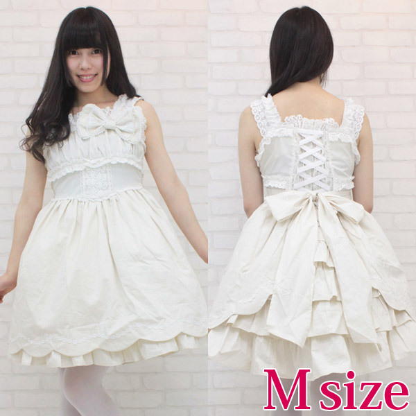 プリンセスのようなふんわり感で可憐にドレスアップ!後ろ姿も可愛いオフホワイトのジャンパースカート(M)。胸元の大きなリボンがワンポイント!リボンはピンで取り外しが出来るので、お好きなアレンジが楽しめます。バックの編み上げデザインとティアードフリルのスカートが、ふんわりキュートな女の子を演出するラブリーなコスチュームです。※水洗い不可、塩素系漂白剤による漂白不可、アイロンは中温で当て布使用、ドライクリーニング可、色落ちの可能性があります。※こちらの商品は在庫の状況によりお届けまでに4日〜7日程度かかる場合がございます。