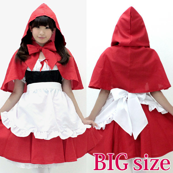 ハロウィンの仮装にもぴったり!めちゃカワ赤ずきんちゃんのコスプレ衣装(BIG)。トレードマークの赤頭巾はフード付きのふんわりケープ型!キュっと結んだ大きめリボンがポイントです。後ろファスナー仕様のワンピースは単品で着てもキュート!フリルエプロンも付属した豪華3点セットです。※水洗い不可、塩素系漂白剤による漂白不可、アイロンは中温で当て布使用、ドライクリーニング可。※こちらの商品は在庫の状況によりお届けまでに4日〜7日程度かかる場合がございます。