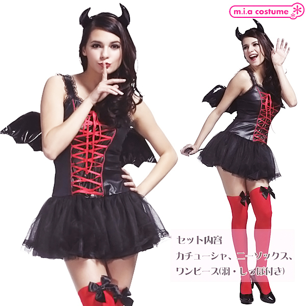 ハロウィンの定番コスプレと言えば悪魔の仮装!羽と尻尾が付いた光沢感の美しい艶やかなエナメル風ワンピースと、角付きカチューシャ、黒いリボンが装飾されたニーソックスのフルコーデセット。フロントの編み上げとボリューム感のあるチュチュが、魅力的な小悪魔に変身させてくれる♪シワになりにくく速乾性に優れたポリエステルを100%使用。※水洗い不可、塩素系漂白剤、アイロン、ドライクリーニング不可、色落ちの可能性があります。※こちらの商品は在庫の状況によりお届けまでに4日〜7日程度かかる場合がございます。 |