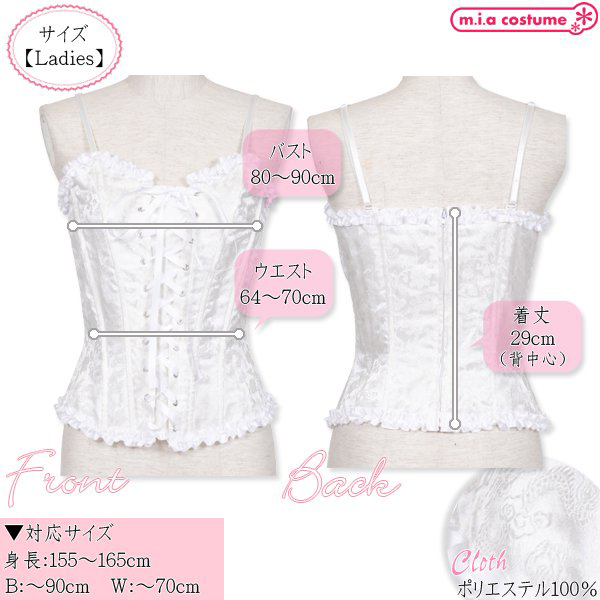 仕様:フリーサイズ:B80〜90cm・W64〜70cm・着丈29cm セット内容:コルセット単品(裏地なし、背面ファスナー) 素材:ポリエステル100% 対応サイズ:身長155〜165cm・B〜90cm・W〜70cm