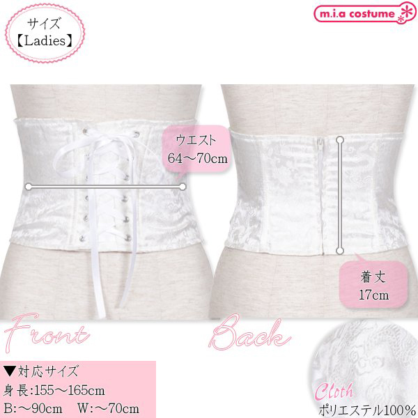仕様:対応サイズ:身長155〜165cm・B〜90cm・W〜70cm 実寸:W64〜70cm・着丈17cm セット内容:コルセット単品(背中心ファスナー) 素材:ポリエステル100% モデル身長155cm