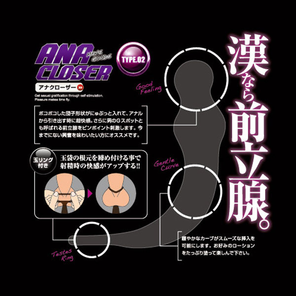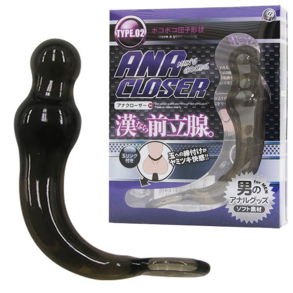 前立腺をピンポイント刺激!ソフト素材の男性用アナルグッズ「アナクローザー TYPE.02」。緩やかなカーブを描くボディは、ひょうたん型の先端形状が特徴!前立腺を刺激しつつ、引き抜く際にも超快感をもたらします!また、持ち手がリングになっているので、玉掛けリングとしてもお使い頂けます。ピンポイント刺激&玉の締め付けがヤミツキになる前立腺グッズです。 |