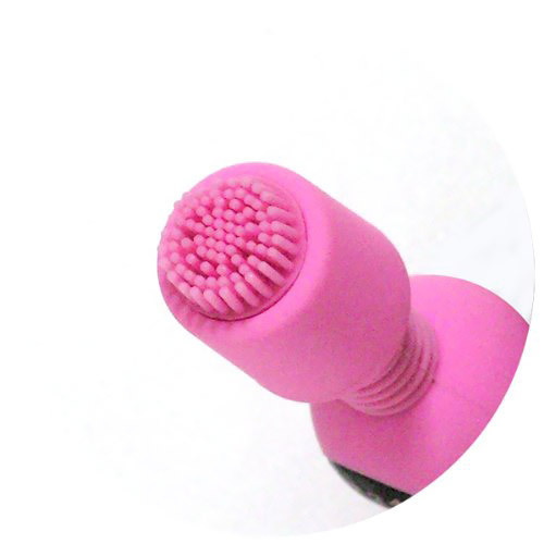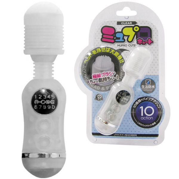 ノーマルヘッドを外すとブラシ型ヘッドが登場!二通りの使い方が出来る、コンパクトでキュートなミニ電マ(クリア)。スイッチを入れるとLEDバックライトが点灯し、ムードある光を放ちます。小さいボディに10種類ものバイブレーション機能を搭載。マットコーティング加工を施して、汚れにくさと肌触りのよさの良いトコ取り!多様に遊べる小型電マです。ボタン電池(LR44)×6個使用。 |