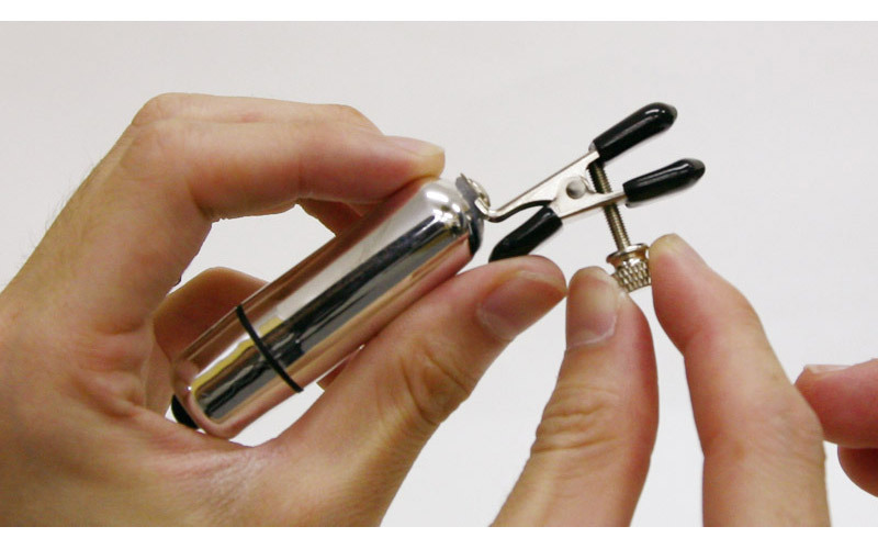 M男、M女さんにオススメ!本能を開花させる、ローター付き乳首クリップ(2個入り)。乳首を挟む部分は、柔らかなゴムで出来ているので安心安全!乳首をクリップでキュッと挟み、ローターでブルブル刺激!初心者だって上級者だって、この「痛気持ちいい」快感がたまらなく病みつきになる!一人でも二人でも楽しめるボディクリップです。ボタン電池(LR44)×3個使用。 |