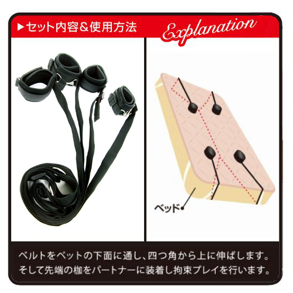 ベッド拘束プレイを自宅でも!あなたの欲望を叶えるSMグッズシリーズ「ELock」。ベルトをベッドの下に通して上下から出し、手枷と足枷をパートナーに装着したら完成!ベッドの脚に繋がなくても良いので、マットレスタイプでも使用可能です。枷はマジックテープ式でサイズ調節も楽々!肌に当たる部分はソフトなウレタン素材を使用し、お肌を痛める心配もありません。エロ絵師、尾髭丹氏の肉感的なパッケージにも注目です。※設置場所の状態を確認してからご使用ください。 |
