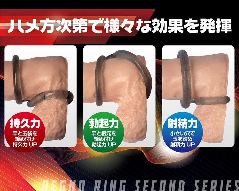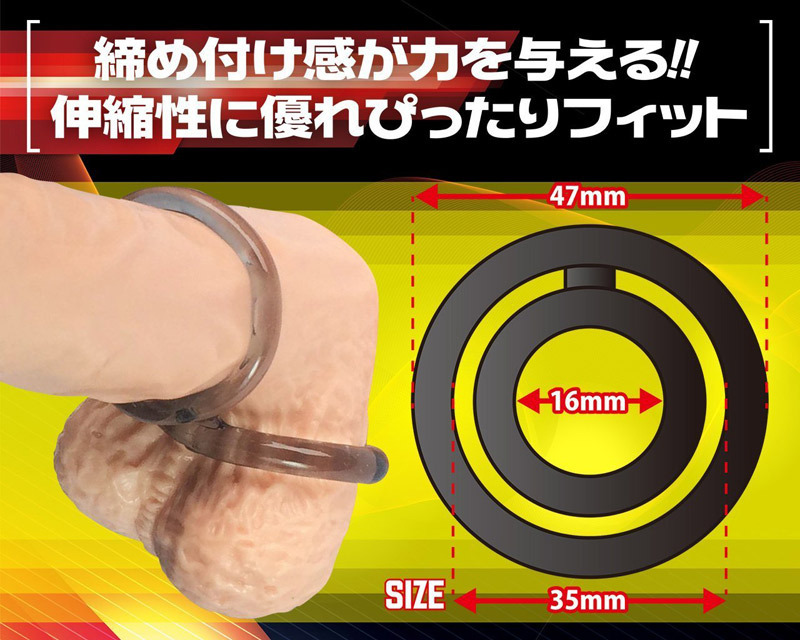 異なるサイズのダブルリングがハードに締め付けるシリコン製コックリング。●レグノコックリングシリーズ●ブラックスモークシリコン製●大小2サイズのリングが一つに●内径:大35mm・小16mm●サオとタマをハードに締め付け。あらゆるサイズに対応する優れた伸縮素材で、大小リングはサオとタマどちらでも装着可能!ハメ方次第で持久力や勃起力、射精力までサポートしてくれる万能ペニスリングです。 |