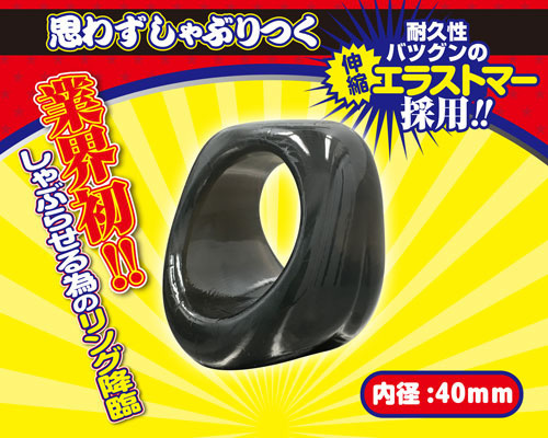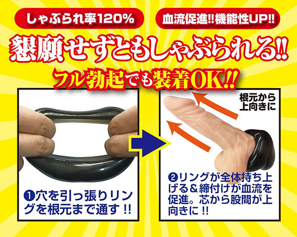 フェラをさせるのに特化した形状のリングです。耐久性と伸縮性の高いエラストマー素材を使っているため、リングの中央に開いた穴を左右に引っ張るだけでフルボッキ状態でも装着可能♪リングをしっかりと根本まで通せるため、しゃぶられ率は120%を突破!根本から上向きにリング全体が持ち上がるので、締め付けによる勃起力アップと同時に血流促進&機能性アップも期待できそうです♪ |