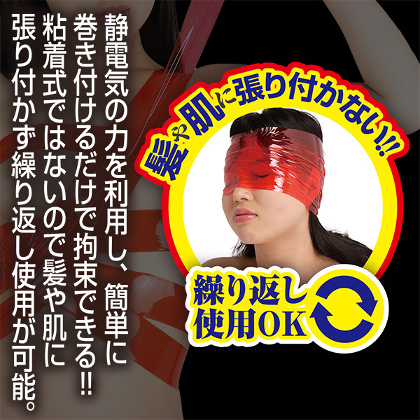 体中どこにでも使用OK!魔法のように吸着できるSMプレイ用拘束テープ。●人気の拘束具「SMart」シリーズ●扱いやすい5cm幅の赤色テープ●全身に惜しまず使える長さ15m●静電気の力による優しい密着感●粘着素材不使用なので再利用OK。普段の生活でもなじみ深い食品用ラップフィルムのように、ピタッと静電気で密着できる拘束テープ。ベタベタしないので髪の毛や顔、アンダーヘアにも利用OK!座らせた椅子ごとグルグル…なんていうプレイもできちゃいます。 |