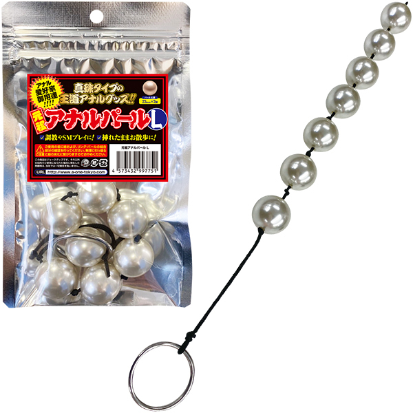 抜き差しの感覚や前立腺を刺激したりとアナルパールを極めた「元祖アナルパール」。こちらは全長36cmでパール直径2.5cm(7連)と迫力満点のLサイズ!真珠のように輝くパール玉をヌプヌプと入れて楽しんだり、直腸内に入れた状態を楽しむなど多彩な快感が自慢。挿れたまま腰をくねらせることで、蠢く感覚が楽しめたり硬いパール玉を入れた状態で体勢を変えたり圧迫を堪能するなど快感も多彩!ロングストロークで直腸内に入れたパール玉を引き抜きながらクライマックスへ至るなど調教やアナルプレイにも最適♪もちろんパール玉を直腸内に挿入したままお散歩するのもOK。【ご注意】ご使用前に紐およびリング・パールの結合部分の確認を行ってください。無理に引っ張ると紐の劣化に繋がりますのでおやめください。 |