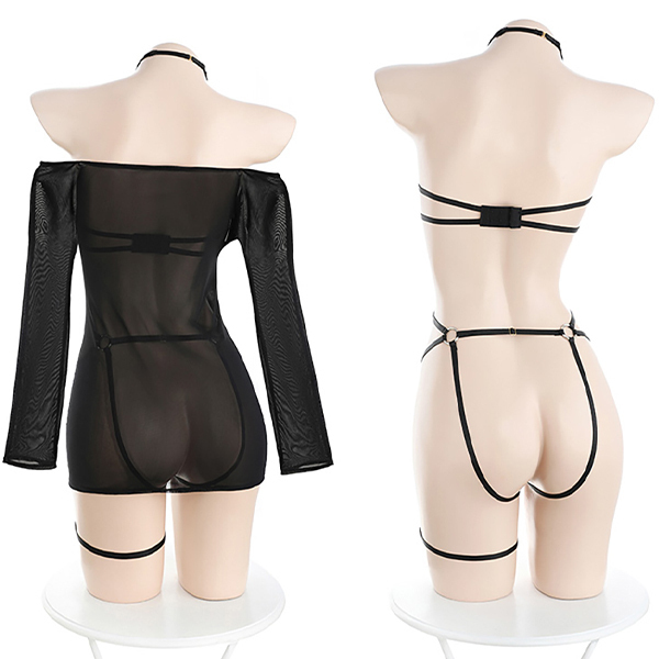 ボディを縦横無尽に巡る、蜘蛛の巣のようなストラップ。ネックとフロントにはメタリックなボタンがキラキラと輝きます。これだけでもボンデージ風テディとして楽しめます。でもこれだけじゃないんです。メッシュの長袖Tシャツも付いて、レイヤードスタイルに。透けるボディが、生肌よりもよりセクシーさを演出します。片脚用のキャットガーター付き