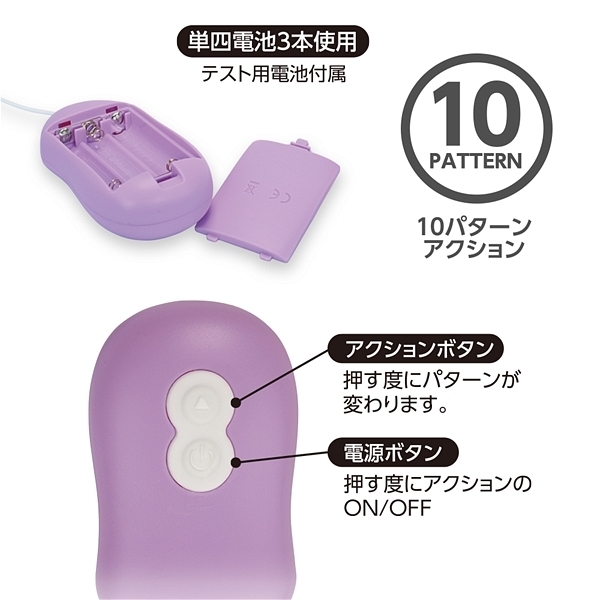 コントローラーの下側からコードが出ているためセルフプレイ時も通常時もコードの煩わしさが軽減されたスタイリッシュデザインのローターです♪握れば分かる使いやすさがウリで、他にはない使いやすさを重視したアンダーコードスタイルが特徴!単四電池3本を使用した4.5Vの強力振動マイクロモーターが搭載されていて、小径ローターで可愛いカラーバリエーション、さらにはマット加工を施すことで上質感を極めた新型ローターです♪10パターンの振動を備え、ハイパワーの4.5V仕様!生活防水仕様なのでローター本体の水洗いもできてローター部分はマット加工だから当て心地も良好♪10パターンアクションをワンプッシュで簡単にONOFF操作が可能です。パステル系で4種類のカラーバリエーションでこちらはパープルになります。 |
