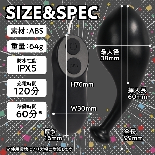 仕様:本体サイズ:コントローラー:3.0×7.6×1.6cm ローター:全長9.9cm×挿入長6.0cm 最大径3.8cm 重量:64g USB充電ケーブル USB充電式