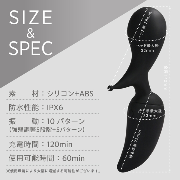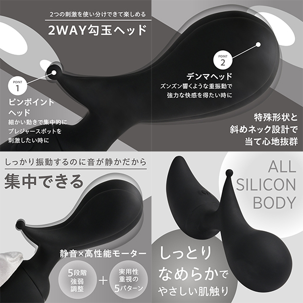ピンポイント刺激とズンズン響く電マ刺激の両方を楽しめる勾玉型デンマです♪2WAYヘッド設計で、ネック部分に角度をつけることでセルフケアにもぴったり!静音×高速振動モーターを搭載し、5段階の強弱調整が可能です♪さらに実用性の高い5つの振動パターンも合わせ、合計10パターンを自在に楽しめます!オールシリコンボディで、しっとりとやさしい肌ざわりが心地よい使用感を実現♪約120分の充電で、最大60分間の連続使用が可能です!(使用環境により変動します!)IPX6相当の防水性能を備えており、使用後はしっかり洗えて清潔に保てます♪デザイン・性能・使いやすさにこだわった信頼の一台です! |