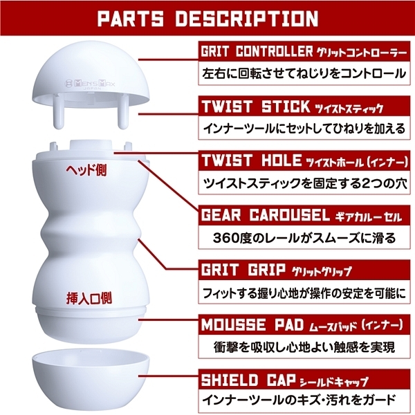 グリットコントローラーは右にも左にもツイスト可能。右と左のひねる方向で内部構造も変化する!お好みのひねり具合で吸着感をコントロール!挿入口のキャップを外しローションを入れて挿入。グリットコントローラーを右に左にねじって刺激の変化を体感せよ。インナーは丸洗い可能。各パーツを取り外し、洗浄・乾燥が終わったら組立てて再び使用可能。アウターケースは耐久性に優れ表面のマット仕上げとフォルムで安心のグリップ感。インナーは約250gで単体のみでの使用も可能なずっしりサイズ。ポケットローション(7ml)付属。グリットコントローラーに付いたスプリングボールとギアカルーセルがかみ合いスムーズな操作性を実現。グリットコントローラーは右にも左にも回せます、右と左のひねる方向で内部構造も変化する!お好みのひねり具合で吸着感をコントロール!<内部構造>@バウンスビーズ 弾力感のある大型ビーズAボーンビーズ 背骨のように連なった縦型極小ビーズBフラップビーズ 斜めに突き出すフラップ型ビーズ |
