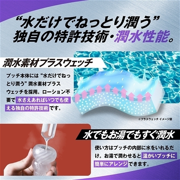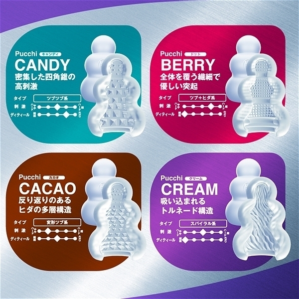 プラスウェッチは独自開発の新素材。水をつけて軽く擦ることで内部の超ミクロサイズで閉じ込められた「潤いゼリー」が水に反応し、沁みだし樹脂表面をねっとりと潤い包みこみます。<デコボコ感さらにクッキリ。>「HD(High Definition)成形」で突起のデコボコ感がさらにクッキリになりました。突起に触れたときの粒立ちが違います。<キャンディー内部構造>「密集した四角錐の高刺激」整然と敷き詰められた四角錘の突起<クリーム内部構造>「吸い込まれるトルネード構造」斜めに擦り上げてくるヒダはクリームのように昇りつめる絶頂感<ベリー内部構造>「全体を覆う繊細で優しい突起」フワフワとした起毛が包み込みまったりしたなめらかな触感<カカオ内部構造>「反り返りのあるヒダの多層構造」ビッシリ並んだヒダは反発しながら複雑に絡みつく刺激 |