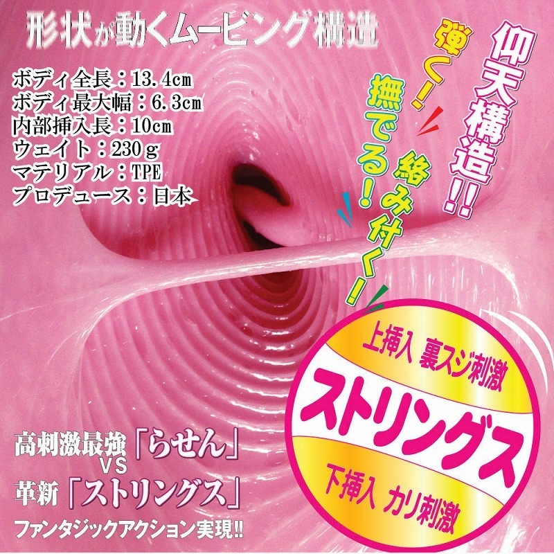 こんなの見たことない!?内部形状にこだわった非貫通型オナホール。形状が動くというムービング構造には、3本のストリングスを使用!内部はヒダとストリングスで出来ていて、挿入時とストローク中に引っかかり気持ちいい!ヒダと素材の相性は抜群で、ゾリゾリ感と絡みつきが病み付きに!ふわふわモチモチ素材で、べた付きや臭いも気になりません。絡み付く、弾く、撫でる、3つの効果が一度に楽しめるオナホールです。 |